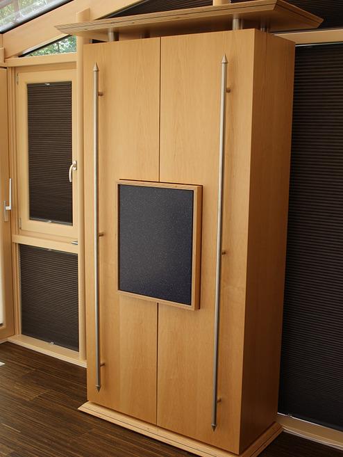 Aus der Grundidee, einen nach außen relativ schlicht wirkenden Schrank mit einem raffinierten Innenleben zu konstruieren und zu bauen, entstand nach Planungs-, Zeichnungs- und Fertigungsphase dieses Meisterstück.