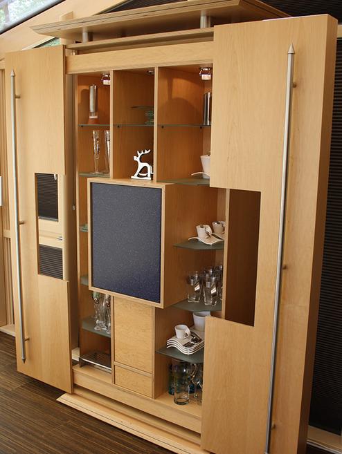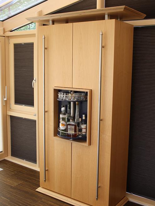 Ahorn furniert mit einem drehbaren Barfach aus Corian® Mineralwerkstoff.