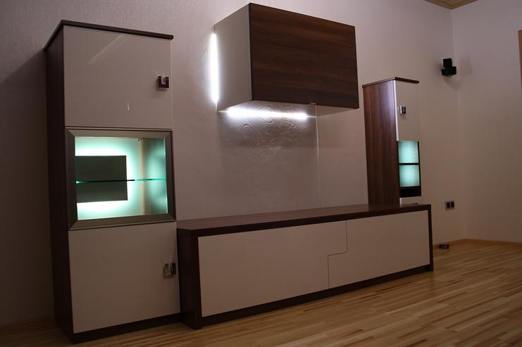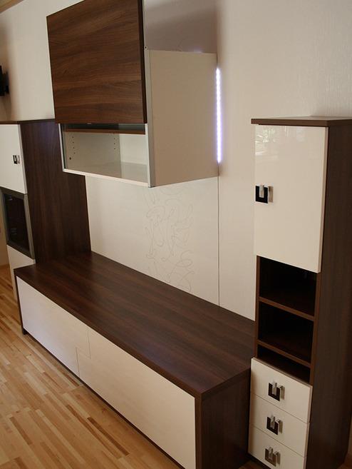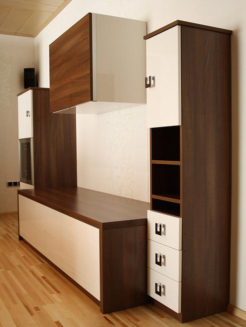 Bei dieser leicht wirkenden Wohnwand, gefertigt aus EGGER Spanplatten im Dekor “Nussbaum Aida tabak” in Kombination mit 19 mm Acrylux-Platten “hochglanz weiß”, liegt die Technik im Verborgenen.