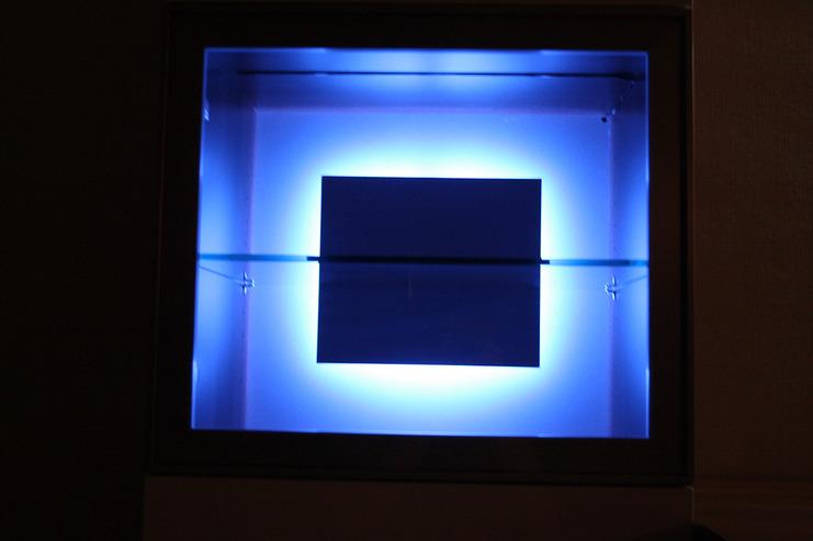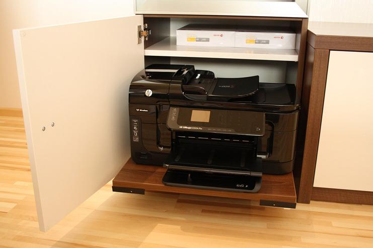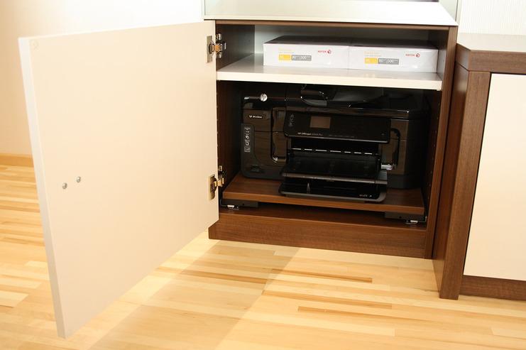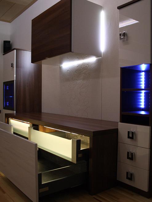 Der Korpus ist hinten mit einem umlaufenden LED-Band versehen und bietet damit eine indirekte Beleuchtung. Das rechte Schrankteil beinhaltet 3 Schubkästen und ein Fach mit Drehtür sowie Regalböden. Im unteren Regalfach befindet sich ein WLAN-Router der kaum sichtbar ist. Im linken Schrankteil befindet sich hinter der unteren Drehtür ein WLAN-fähiger Drucker mit Auszugsboden, somit hat man einen verborgenen, zentralen Drucker im Wohnzimmer. Über dem Druckerfach befindet sich eine grifflose Glasrahmentür, die aus dem Mittelteil einen Vitrinenschrank mit Glasboden schafft. Das besondere ist die beleuchtete Rückwand, die durch ein vorgesetztes Quadrat mit LED-Beleuchtung und Farbwechseln unterschiedliche Lichtstimmungen zaubert. Der gleiche Farbwechsel ist syncron in den offenen Regalfächern im rechten Schrank zu sehen.