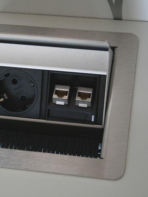 Diese ist durch einen IR-Repeater auch bei geschlossenen Türfronten über die Gerätefernbedienung steuerbar. Die Schrankwand soll auch bei Bedarf als Homeoffice benutzt werden, daher wurden die Unterschränke in der Mitte geteilt und offen gestaltet. Um diesen Bereich mit der durchgehenden Deckplatte als Schreibtisch zu nutzen, wurde hier eine Einbausteckdose mit Netzwerkanschluss integriert.