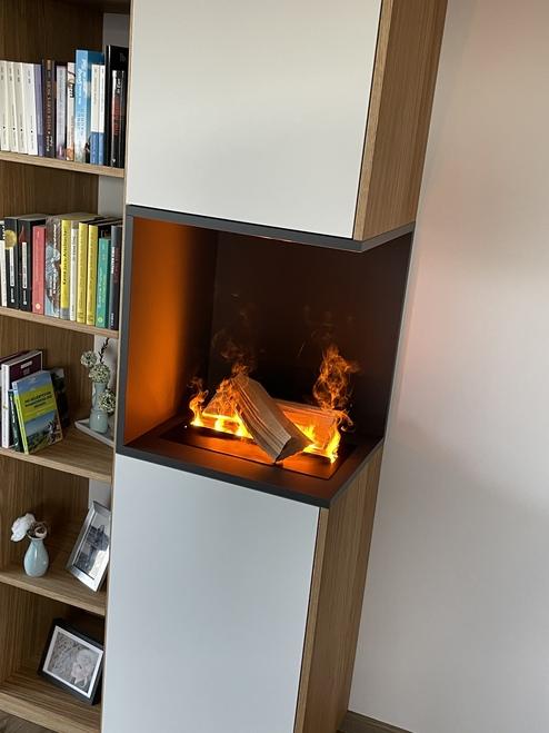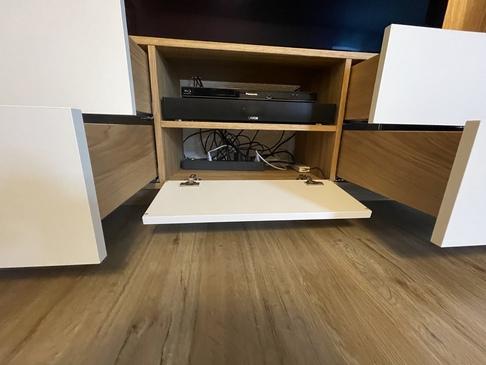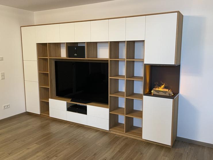 Die Wohnwand haben wir aus geölter Eiche hergestellt und die Fronten aus weißen EGGER PerfectSense Lackplatten mit Anti-Fingerprint-Eigenschaften gefertigt. Durch die hellen grifflossen Fronten und den offen gestalteten Regalen wirkt diese Schrankwand leicht und gemütlich zugleich. Was zum einen an der geöten Holzoberfläche liegt aber natürlich auch besonders durch die Integration unseres Möbelfeuer®. Durch den beruhigenden Flammeneffekt des Möbelkamin, wird dieser Wohnzimmerschrank perfekt in den Wohnraum mit Esszimmer und offener Küche eingebunden. Die echte Tiroler Almwiese, welche wir auf einer Trägerplatte als Wandbild gefertigt haben, haucht dem Raum ebenfalls noch ein Stück Natur ein. Doch auch die integration von TV- & Hifi-Geräten darf in einer solchen multifunktionalen Wohnwand nicht fehlen. Auch dies haben wir so umgesetzt das es für unsere Kunden die perfekte Verschmelzung von Bedienkompfort und zurückhaltender Optik (bei ausgeschalteten Geräten) ergibt.