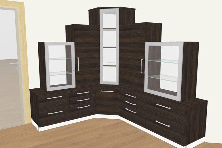 Wohnzimmerschrank über zwei Wandseiten mit Vitrinen