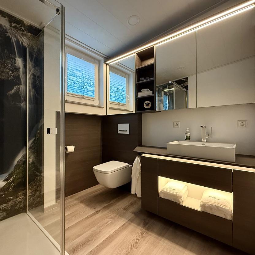 Die im Flurbereich integrierte Einbaugarderobe oder das Treppenhaus mit einer 3D Wandverkleidung sind neben modernen Türen, Wandleuchten aus Holz und einer Möbelfeuer-Säule, nur ein kleiner Vorgeschmack unserer Räumlichkeiten.