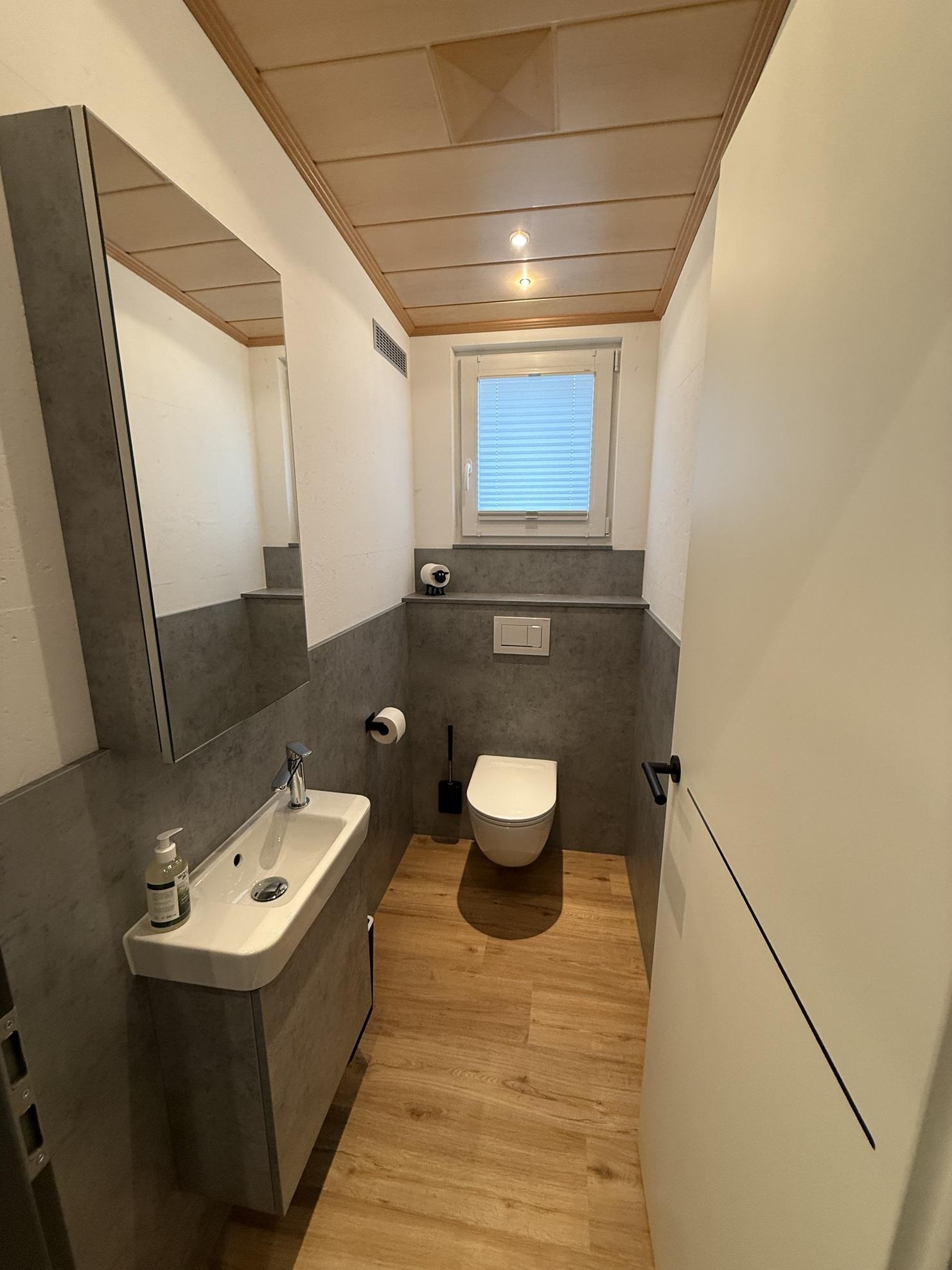Erleben Sie das Gäste-WC in einem durchgängigen Dekordesign in Betonoptik – stilvoll, modern, zeitlos. Ein Handwaschbecken mit Unterschrank bietet klare Linien und praktischen Stauraum, darüber ein kompakter Spiegelschrank mit innenliegendem Stauraum für Ordnung auf kleinstem Raum.